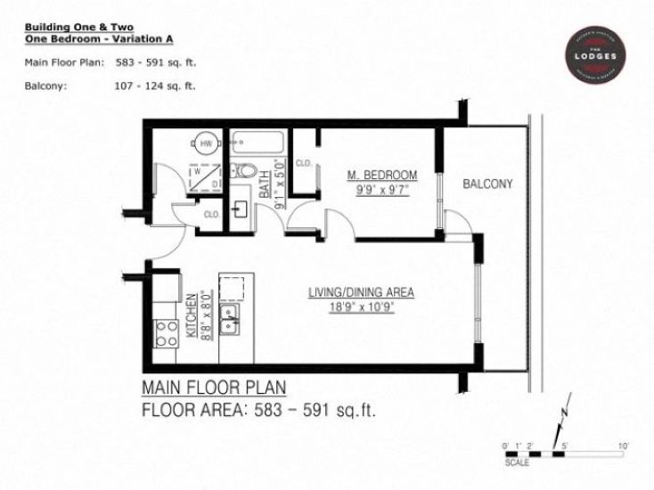 1 bedroom 1 bathroom condo in the Lodges at Packers Junction community. Located downtown in the heart of the city. This end of the hall condo with 583 sq ft. plus a 120 sq ft private balcony. Galley style kitchen includes 4 stainless steel appliances, overhead cabinets and breakfast bar. Open floor concept leads to living room with luxury vinyl flooring, surf station, air conditioning with patio access. Bedroom has walk through to bathroom. Bathroom includes a full-sized soaker tub with shower in modern design. In suite laundry included.