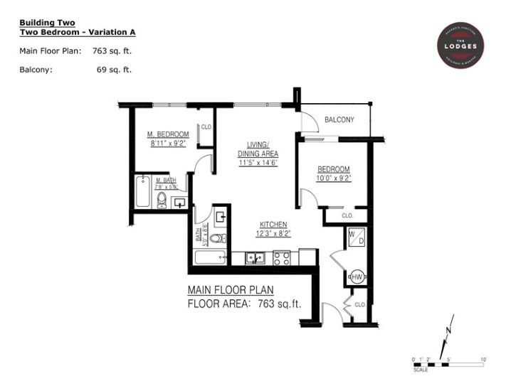 2 bedroom 2 bathroom condo in The Lodges at Packers Junction. Located downtown in the heart of the city. This split bedroom 763 sq ft design with a 69 sq ft deck. Galley style kitchen includes 4 stainless steel appliances, overhead cabinets and breakfast bar. Open floor concept leads to full dining room and living room with luxury vinyl flooring, air conditioning and balcony access. Bathroom includes a full sized soaker tub with shower in modern design. In suite laundry included.